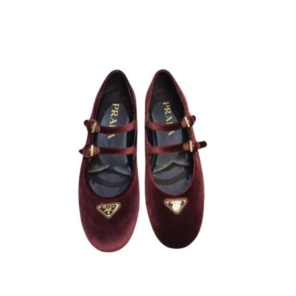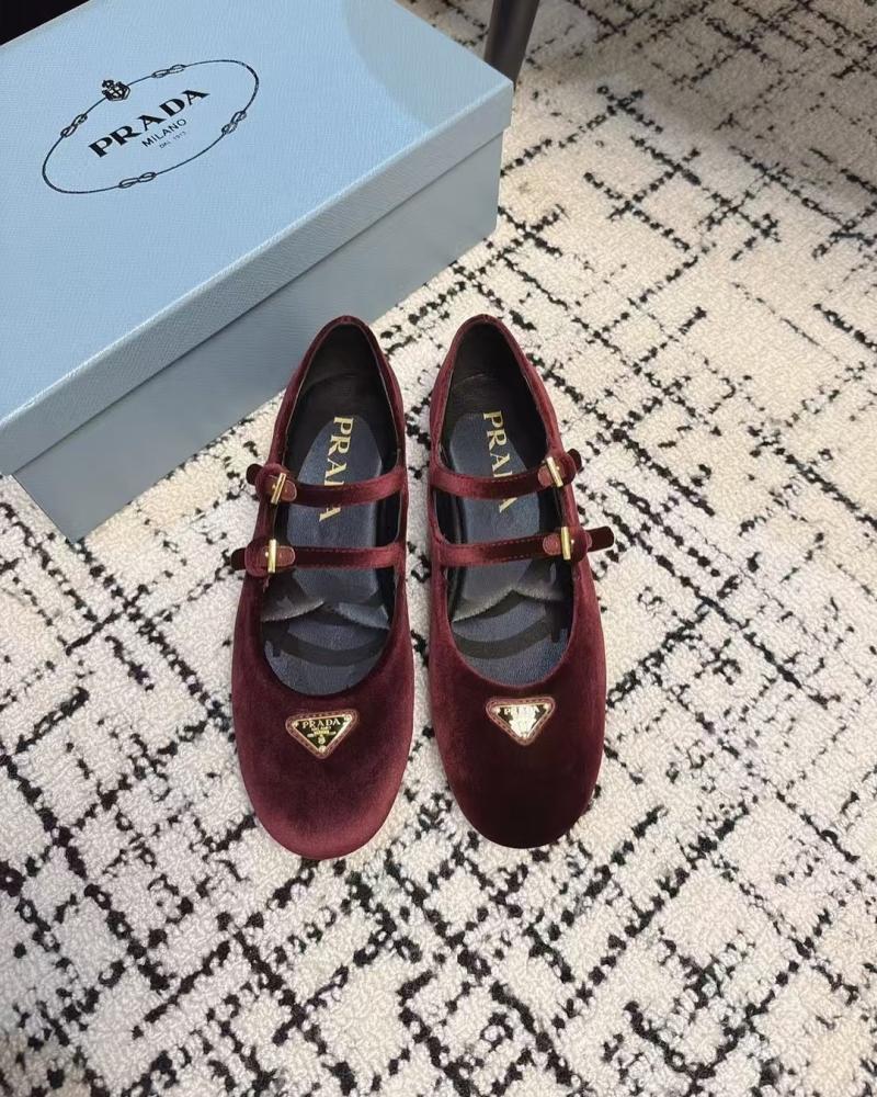 تألقي بأناقة لا مثيل لها مع حذاء باليرينا بلمسة مخملية من برادا. احصلي على هذا الحذاء الفاخر الآن وأضيفي لمسة من الفخامة والرقي إلى إطلالتك اليومية.