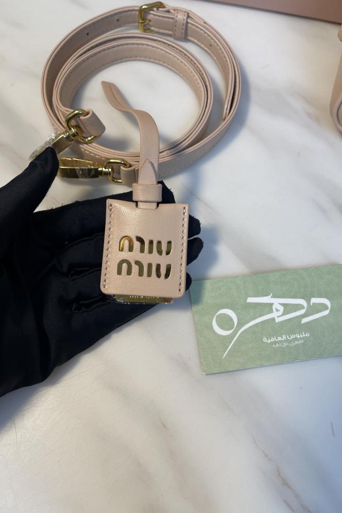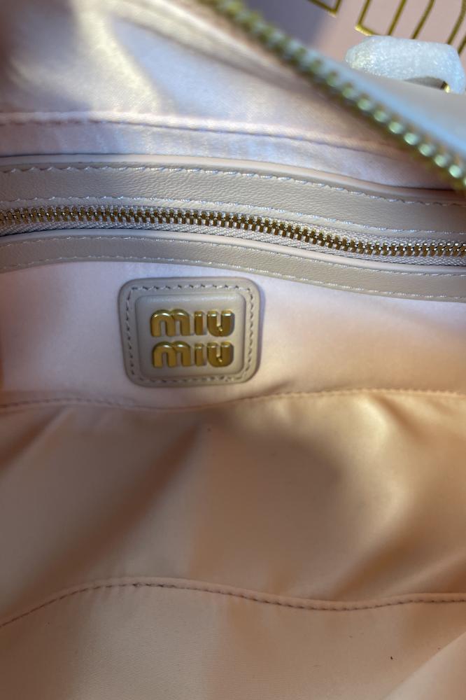 - شعار ميو ميو المعدني الذهبي يضفي لمسة فاخرة على الجهة الأمامية.
