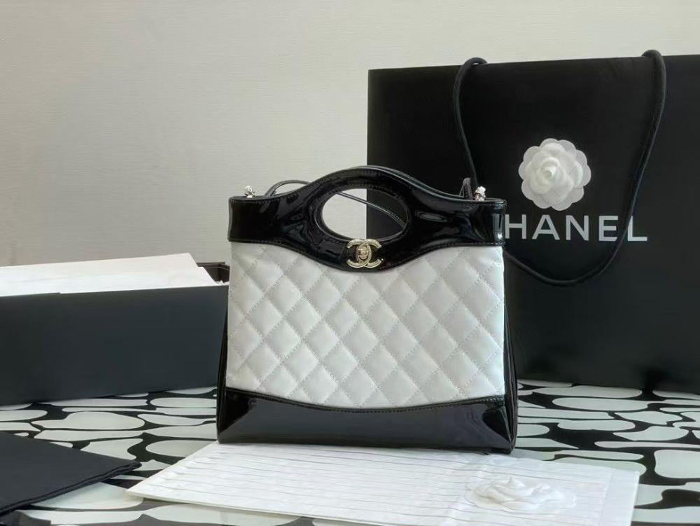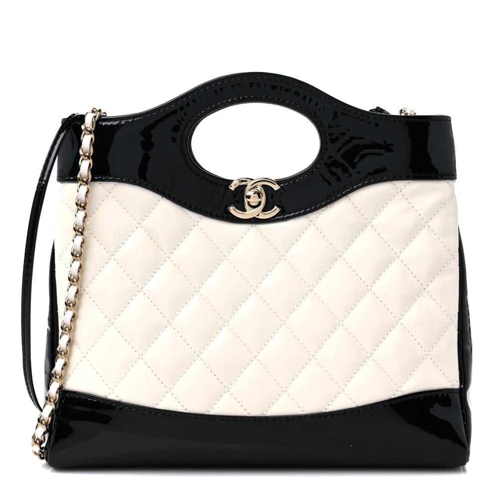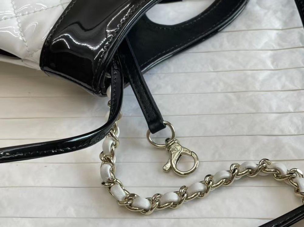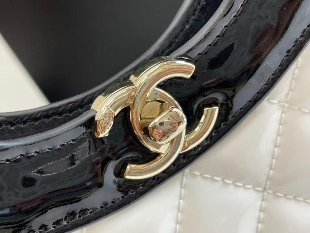 حقيبة تسوق شانيل ميني مبطنة من جلد لامع باللونين الأبيض والأسود