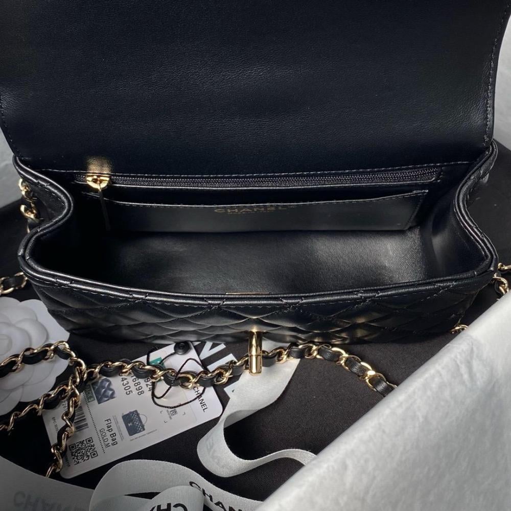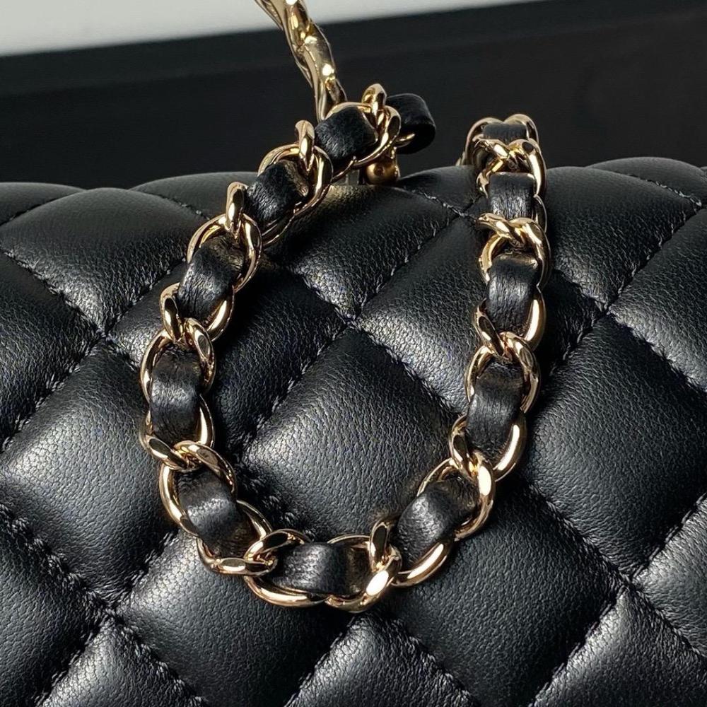 - حقيبة شانيل ميني فلاب تأتي بمقبض علوي يسهل حملها ويضفي لمسة من الأناقة الكلاسيكية.