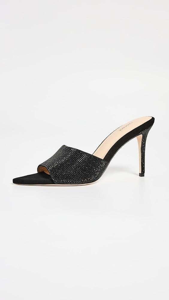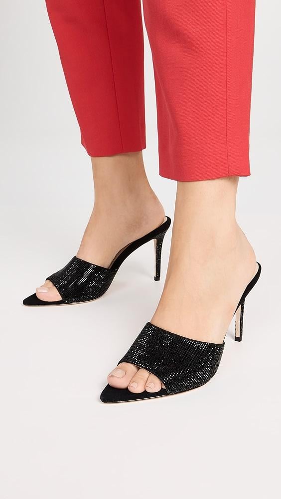 يأتي الصندل بمقدمة مدببة مفتوحة تمنح القدم مظهرًا أنثويًا أنيقًا، بينما يزدان الجزء العلوي بغطاء شبكي مرصع بكريستالات متناسقة تضيف بريقًا ناعمًا دون مبالغة.