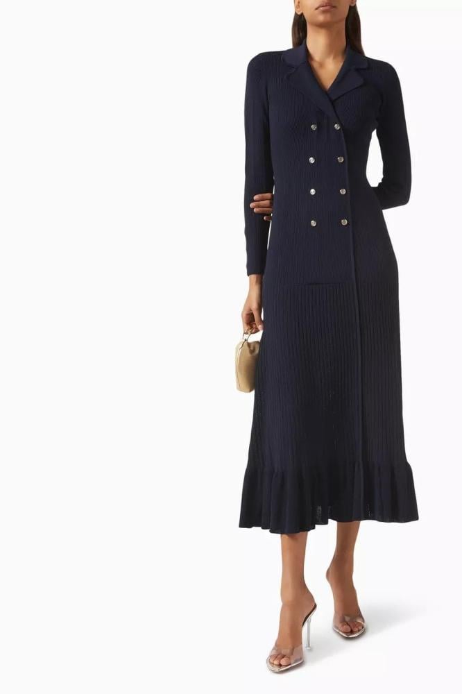 - ياقة أنيقة وأزرار مزدوجة تمنح الفستان مظهرًا كلاسيكيًا بطابع عصري.