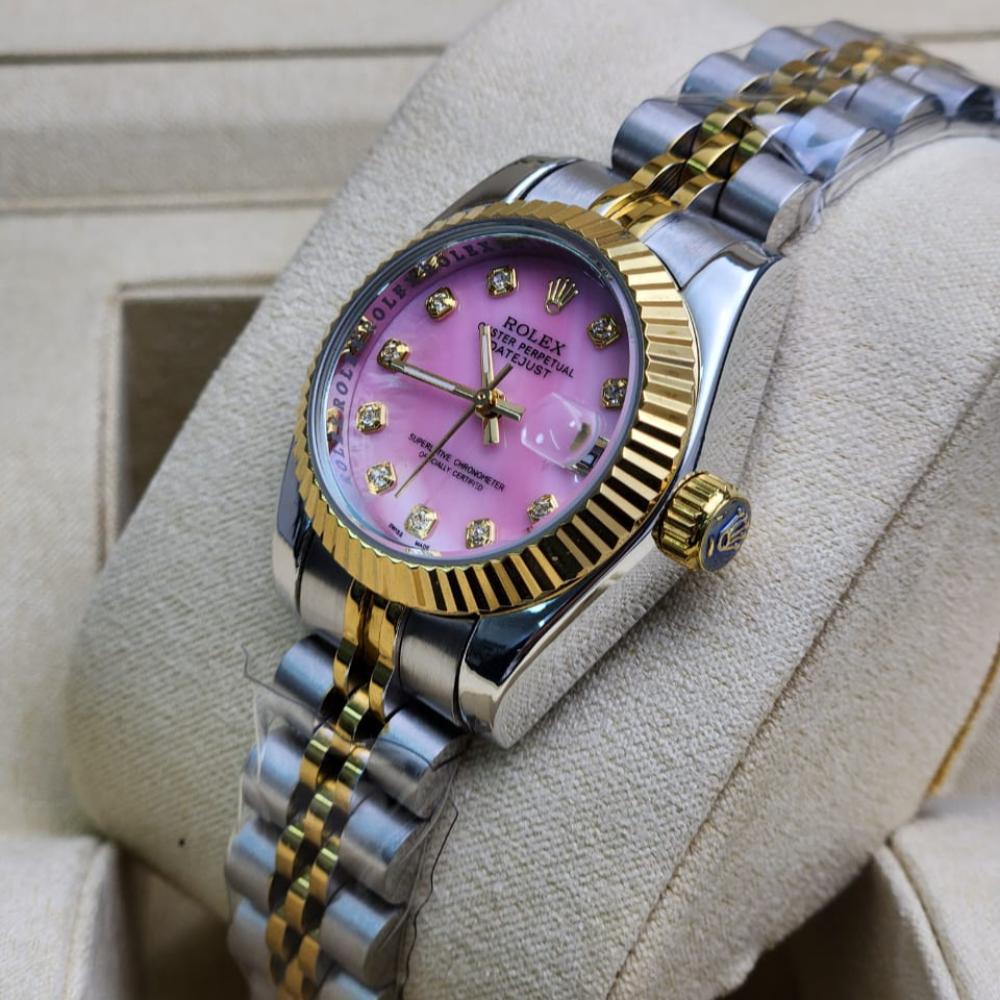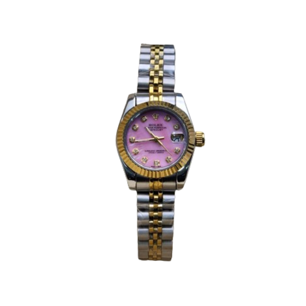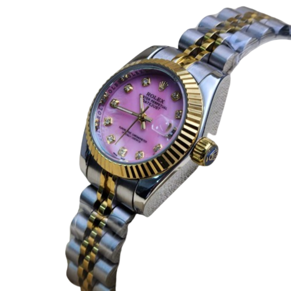 تجمع هذه الساعة بين التصميم العصري واللمسات الكلاسيكية التي تُميز رولكس، حيث يأتي وجه الساعة بلون وردي ناعم يضفي أنوثة راقية، وتُزينه حلقة ذهبية لامعة تضيف بريقًا يخطف الأنظار.
