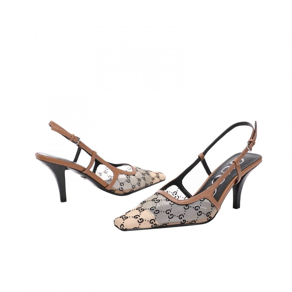 • التصميم: كعب متوسط بارتفاع 7.5 سم مع حزام خلفي ووجه شبكة الورد بشعار GG.