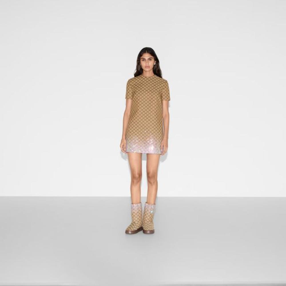 يعتبر الفستان القصير من كانفاس GG من قوتشي من القطع الفريدة التي تجمع بين الأناقة والفخامة. مصنوع من كانفاس GG باللون البيج، يتميز بتطريز كريستالي بتأثير متدرج مما يضيف لمسة من التألق. تصميمه المبطّن وذو الياقة المجوّفة يجعل هذا الفستان خيارًا رائعًا لكل سيدة تبحث عن الجمال والراحة.