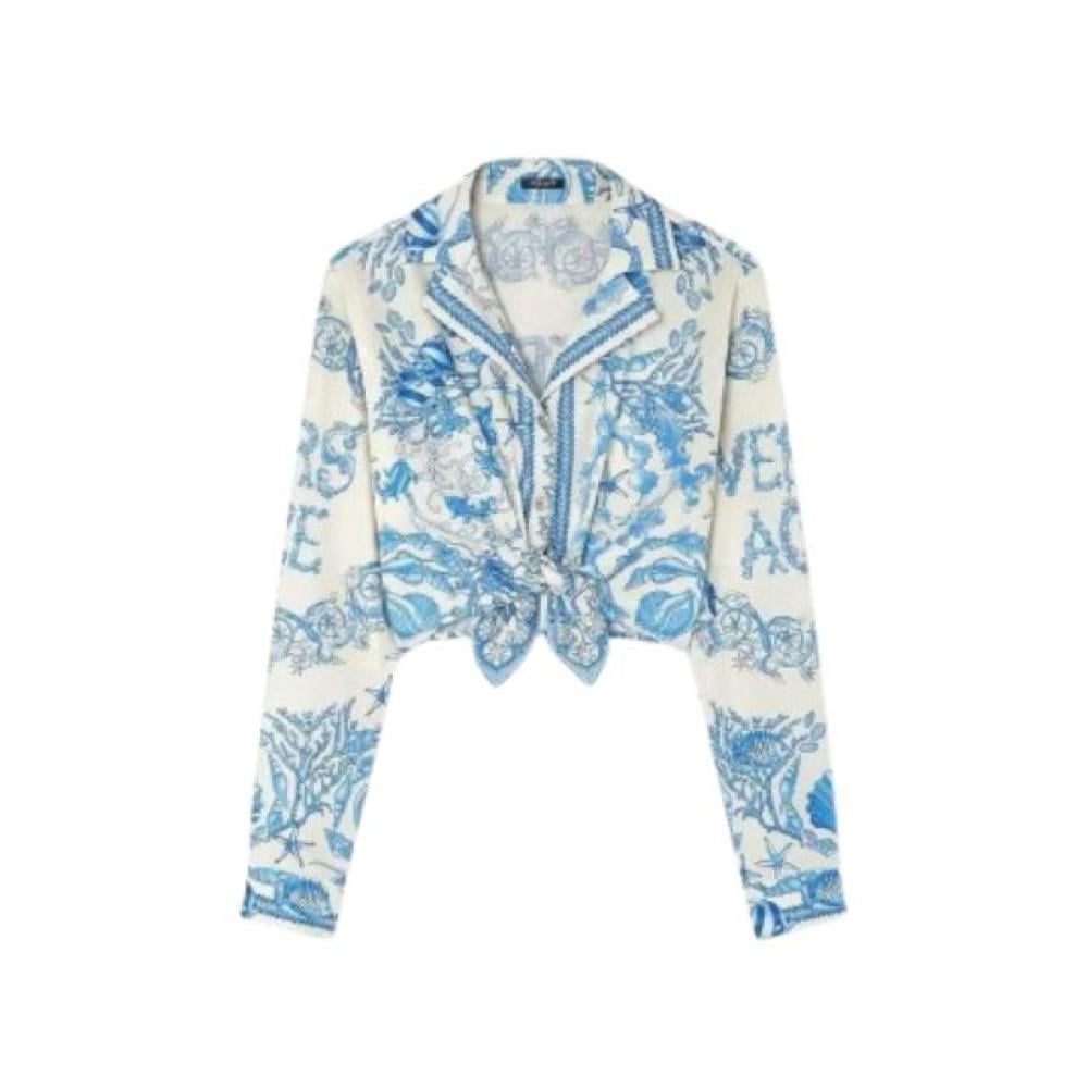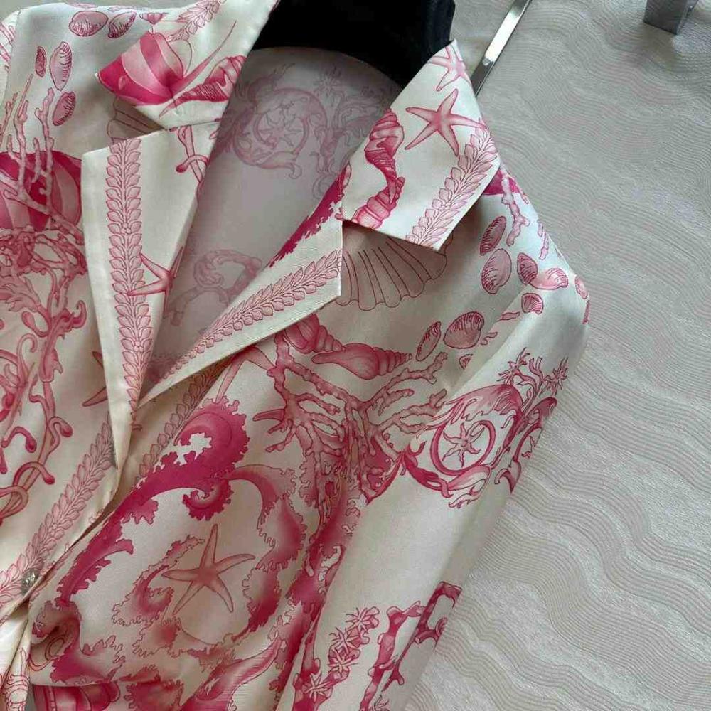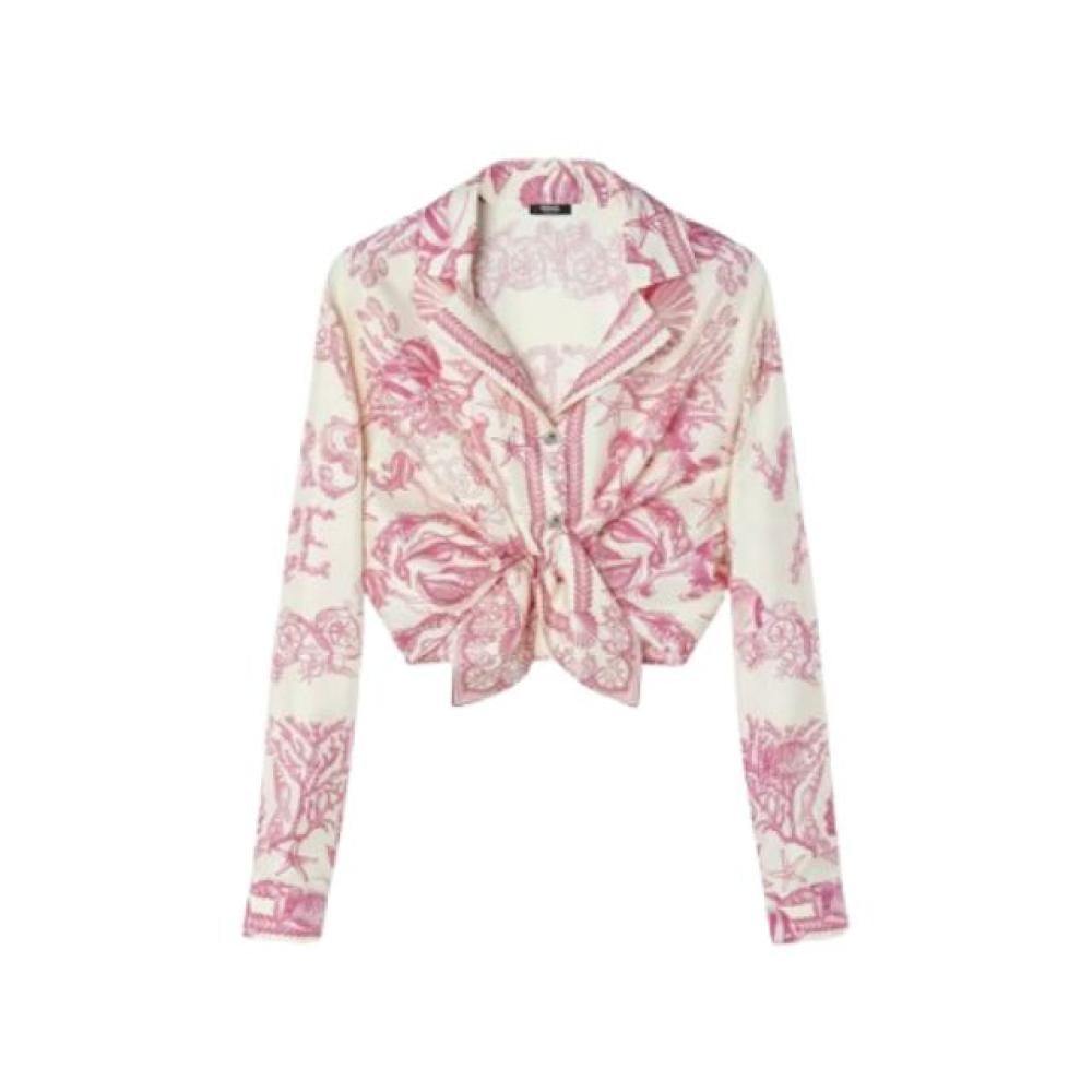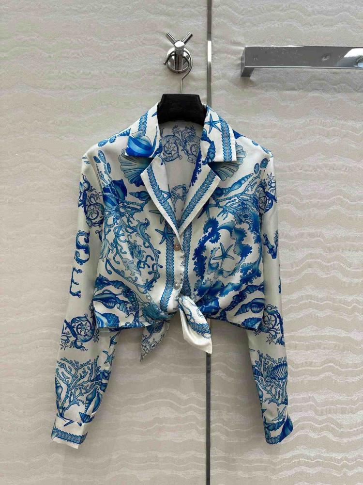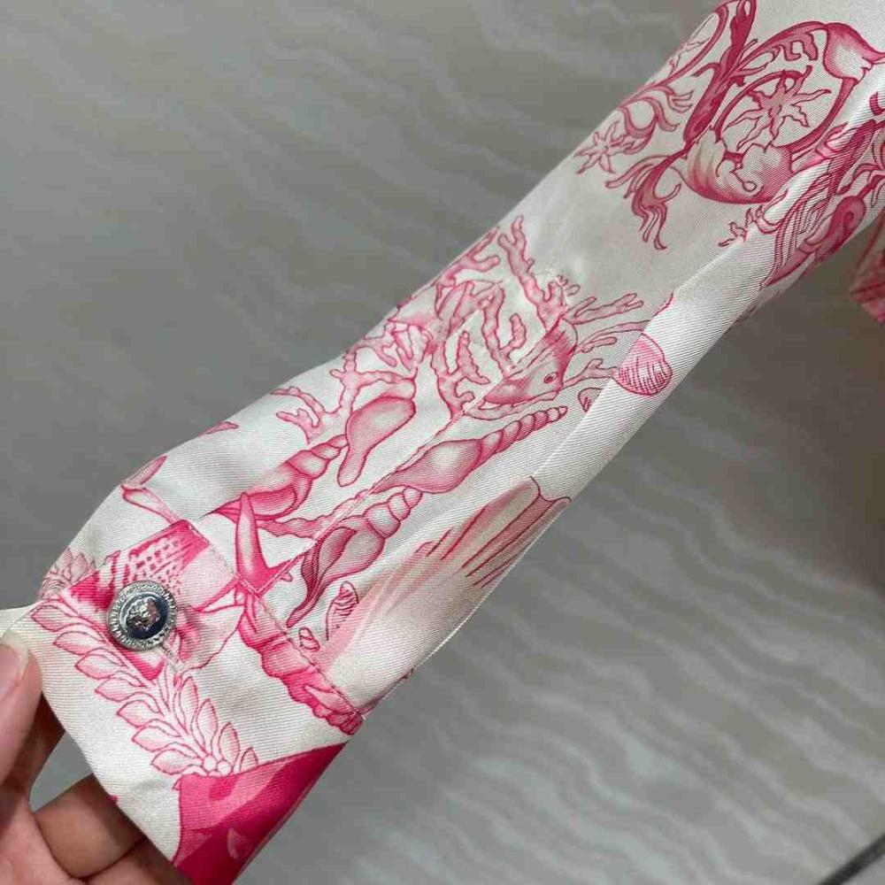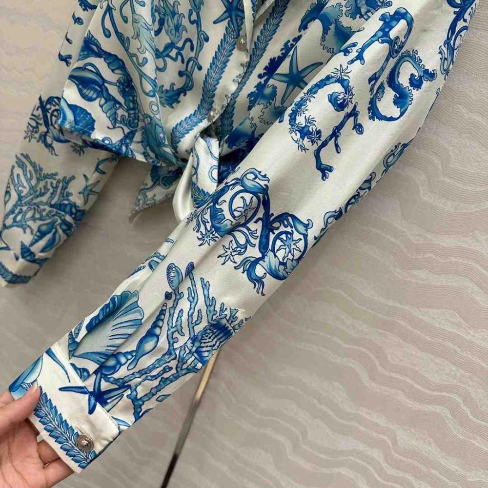 يتميز هذا القميص بتصميمه الفاخر المصنوع من الحرير المائل، مما يمنحك إحساسًا بالنعومة والانسيابية. تأتي طبعة باروكو تحت الماء لتضفي عليه طابعًا ملكيًا يعكس الفخامة والتميز، بينما تضيف الزخارف المستوحاة من الصدف والمرجان ونجم البحر لمسة من الأناقة المستوحاة من الطبيعة. كما يتميز التصميم بعقدة أنيقة على المقدمة، مما يمنحك إطلالة جذابة ومميزة.